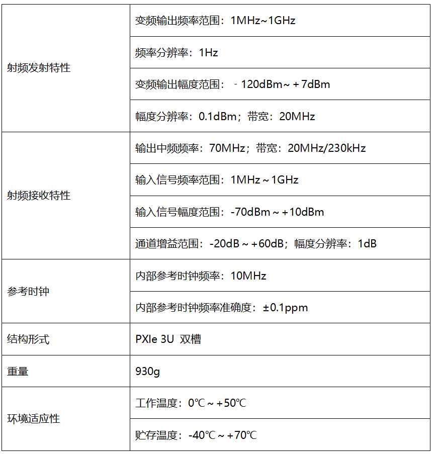 具备射频接收发射及幅度调理功能,可接收1MHz~1GHz的输入射频宽带信号变频到70MHz中频,以及将171MHz中频信号变频到1MHz~1GHz输出。可通过PXIe接口接收各种指令执行相应的功能。
